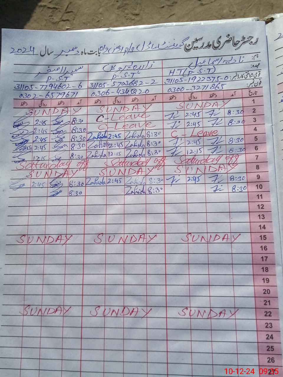 | CNIC | Full Name | Designation | R/C | Absence During Last Calender Month |