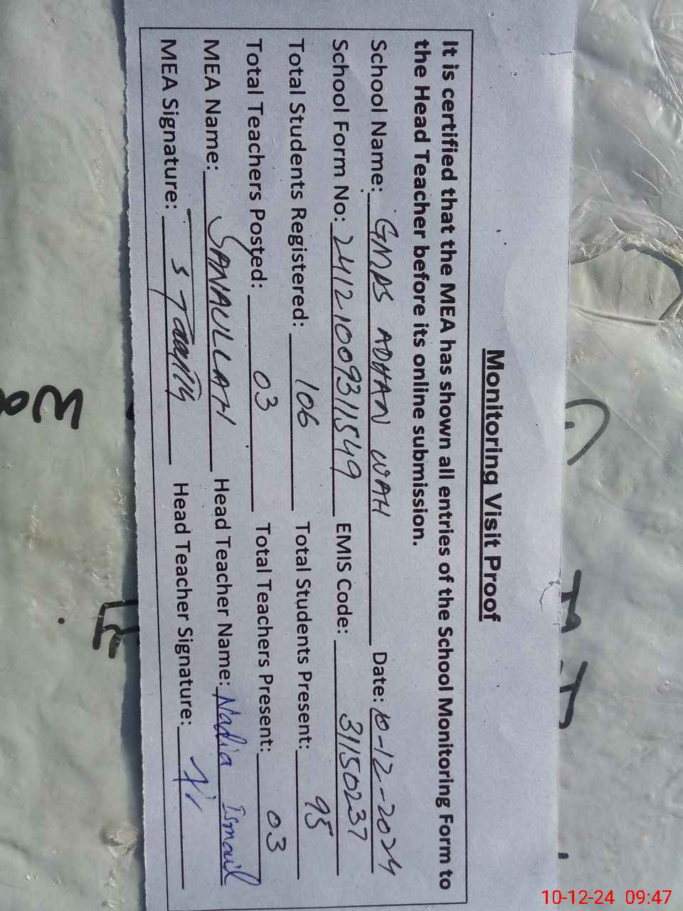 | EMIS Code: 31150237 | Name of School: GMPS ADHAN WAH | |||