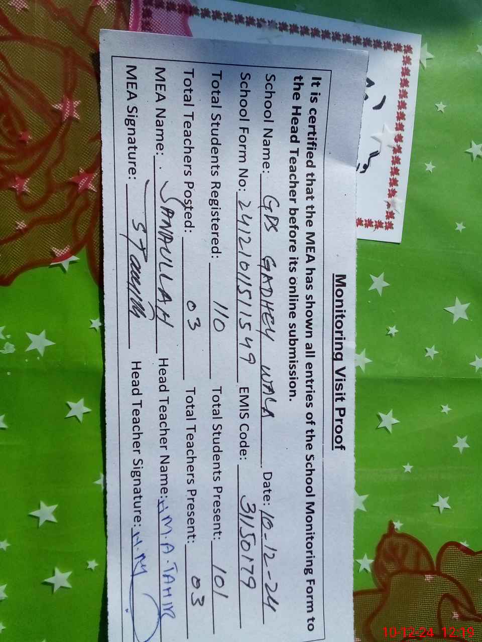 | EMIS Code: 31150179 | Name of School: GPS GADHEY WALA | |||