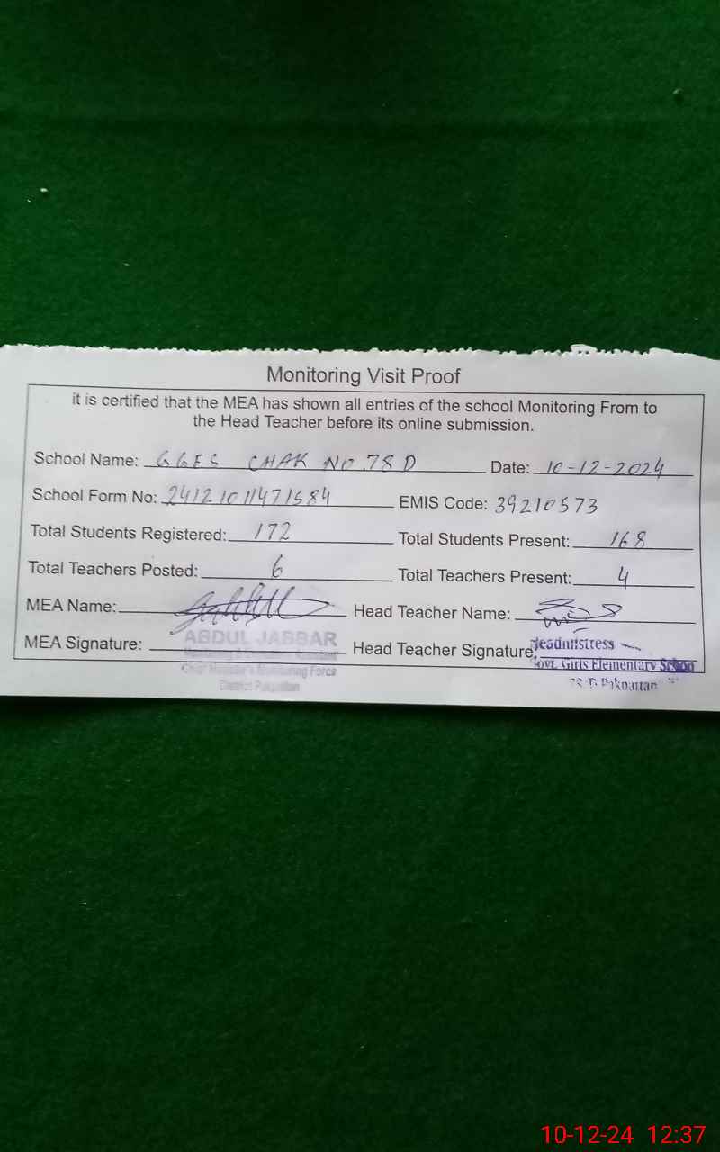 | EMIS Code: 39210573 | Name of School: GGES CHAK NO. 78/D | |||