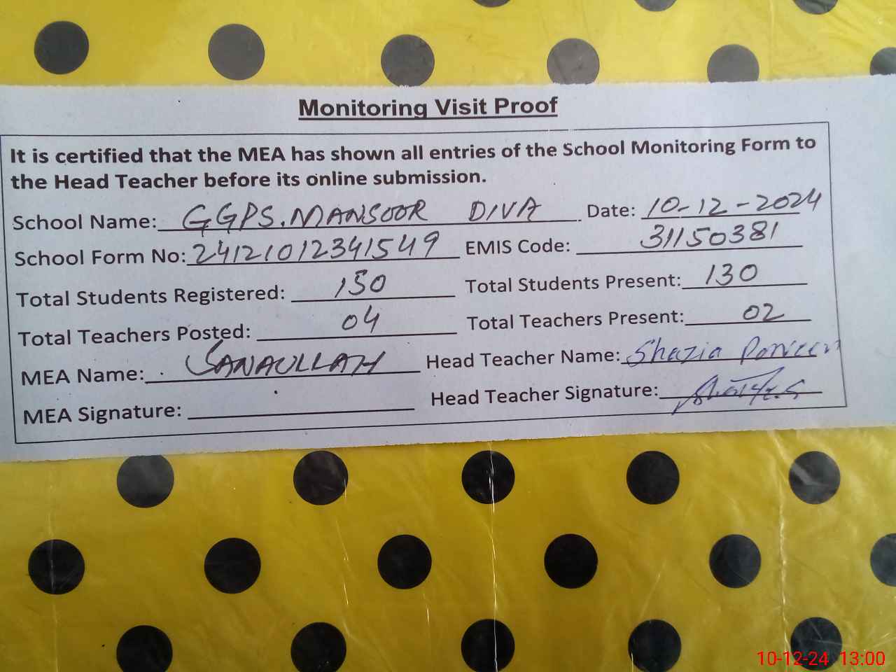 | EMIS Code: 31150381 | Name of School: GGPS MANSOOR DIVA | |||