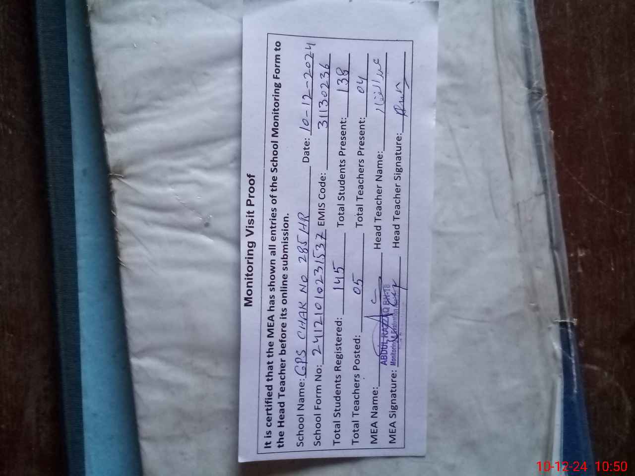 | Attendance Register | Head Teacher | MEA with School | Visit Proof |