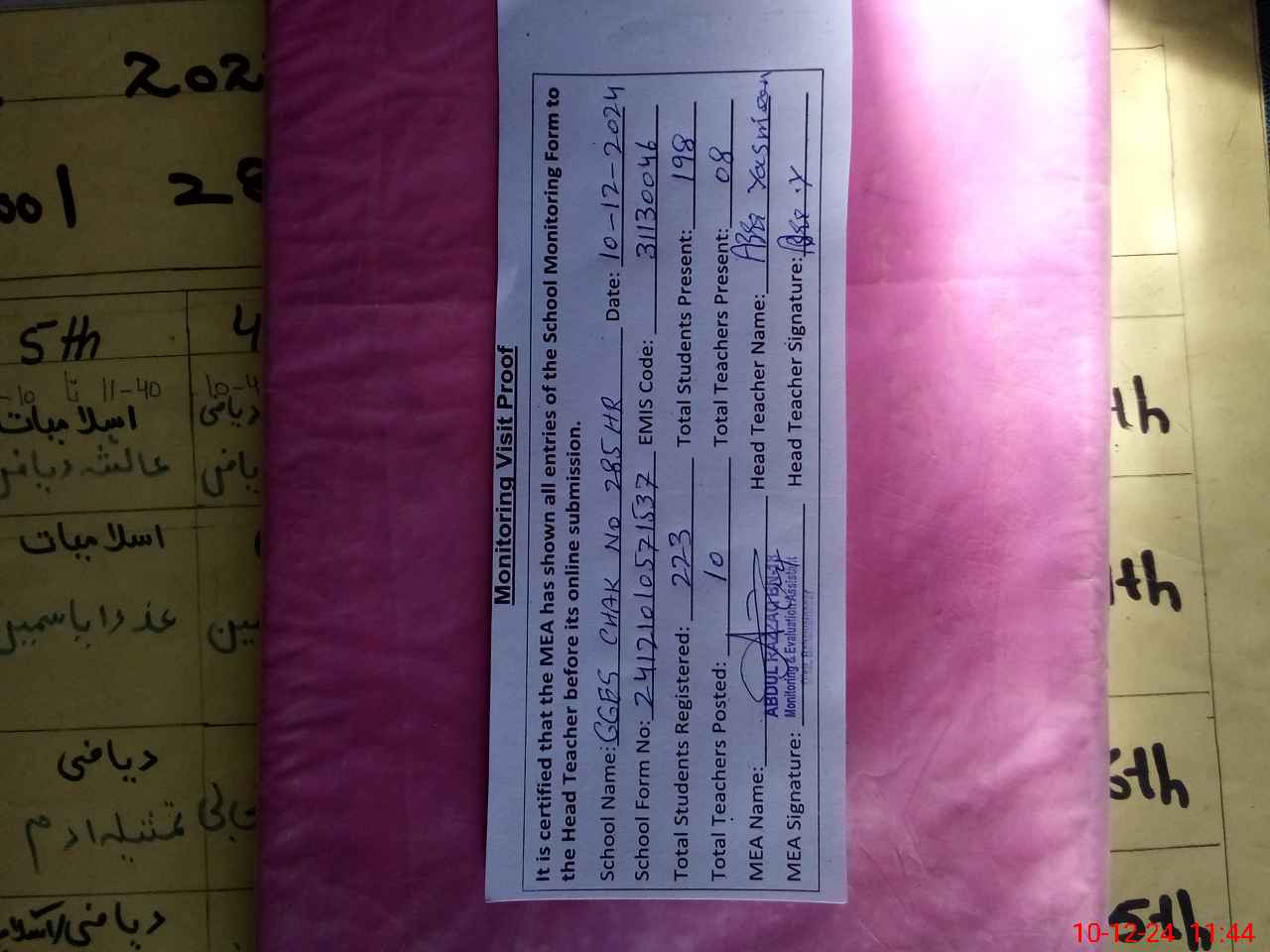 | Attendance Register | Head Teacher | MEA with School | Visit Proof |