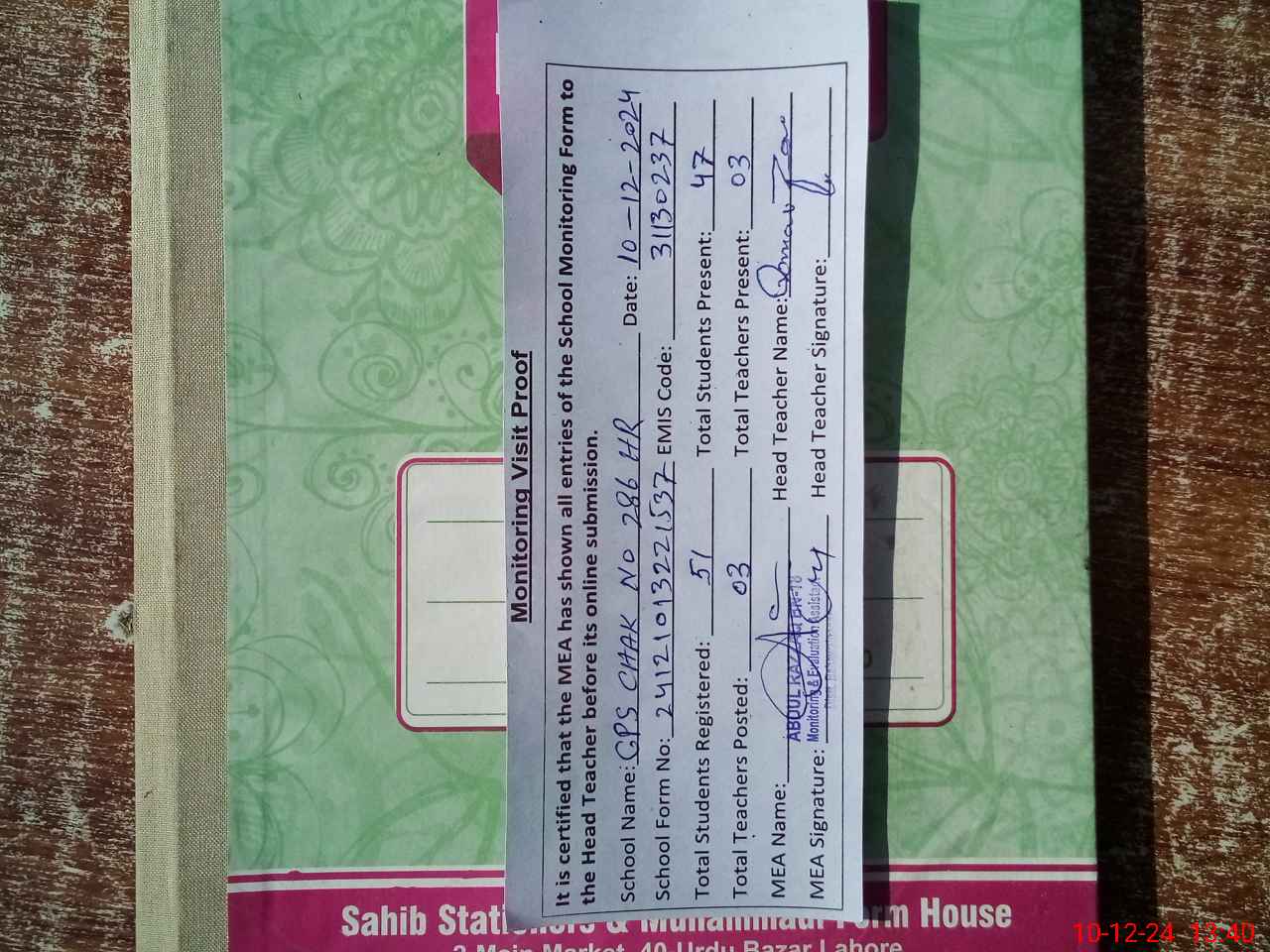 | EMIS Code: 31130237 | Name of School: GPS CHAK NO 286 HR | |||