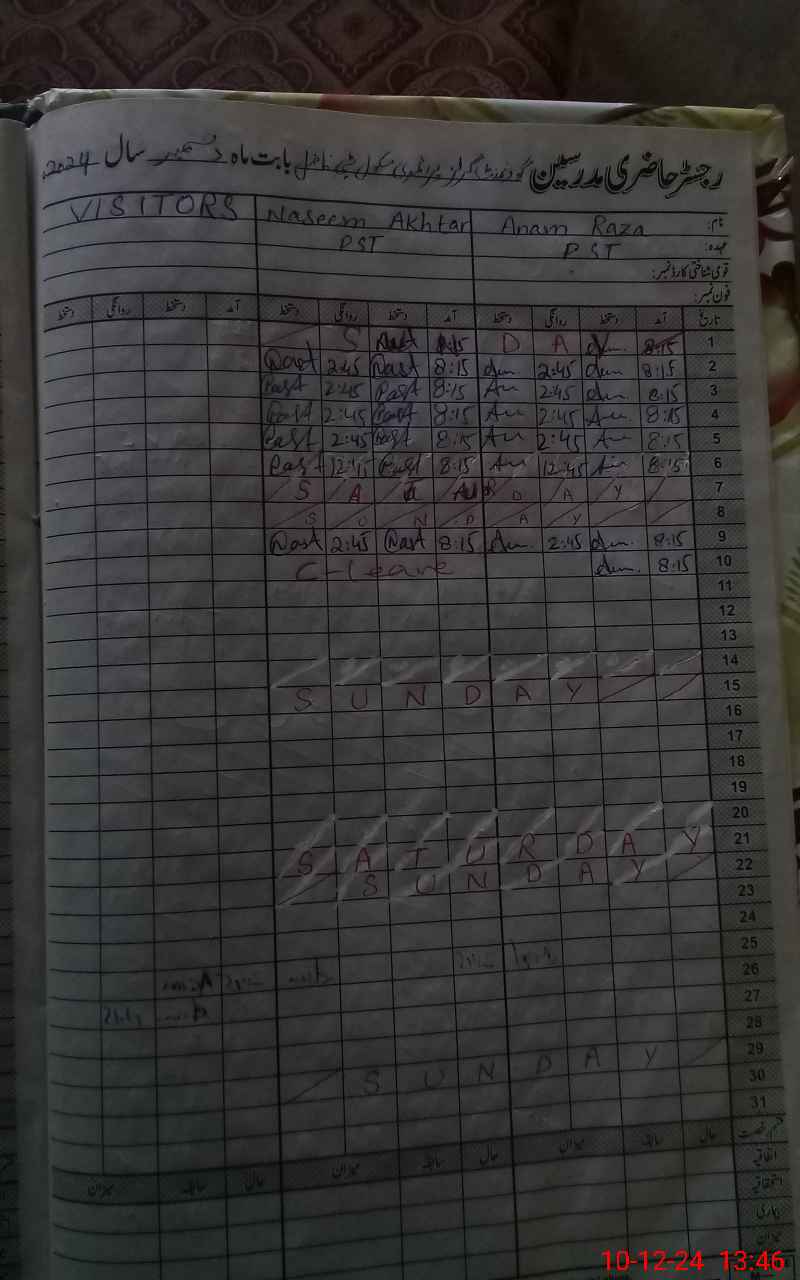 | CNIC | Full Name | Designation | R/C | Absence During Last Calender Month |