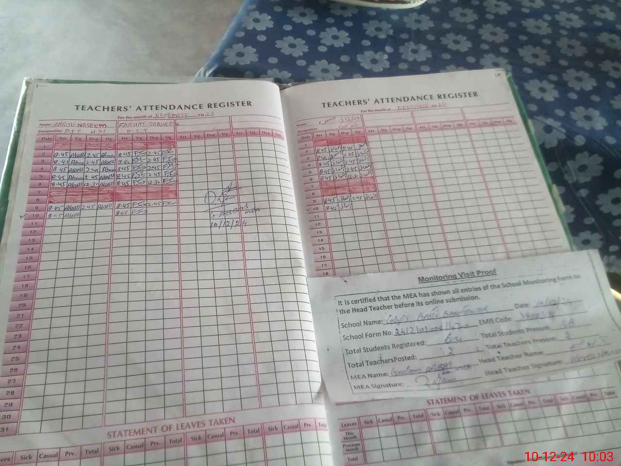 | Attendance Register | Head Teacher | MEA with School | Visit Proof |