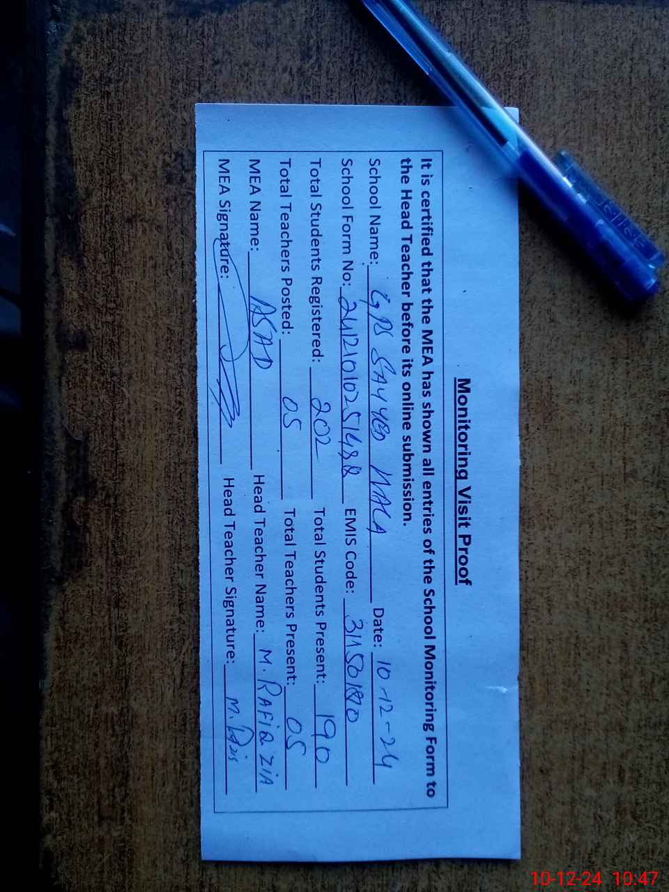 | Attendance Register | Head Teacher | MEA with School | Visit Proof |