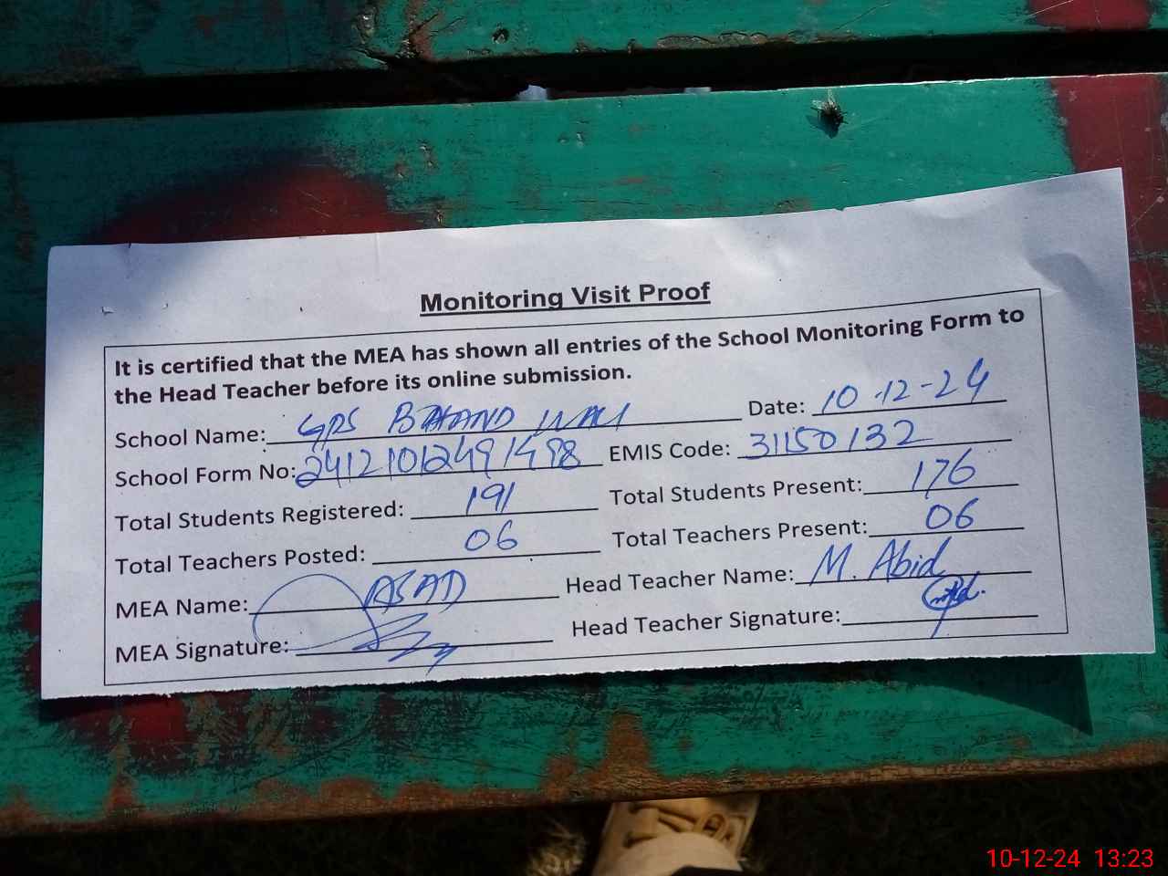 | EMIS Code: 31150132 | Name of School: GPS BHAND WALI | |||