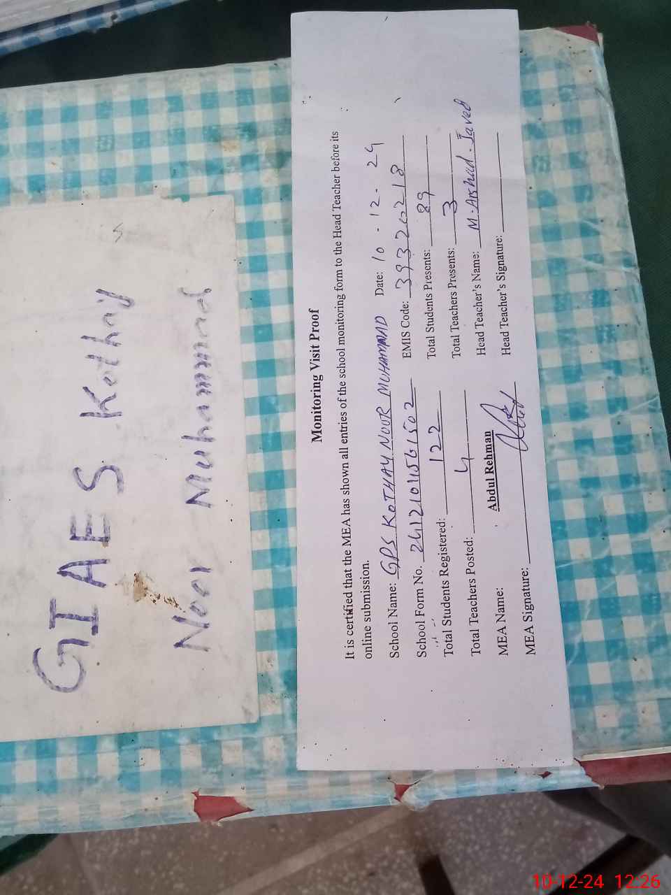| EMIS Code: 39320218 | Name of School: GPS KOTHAY NOOR MUHAMMAD | |||