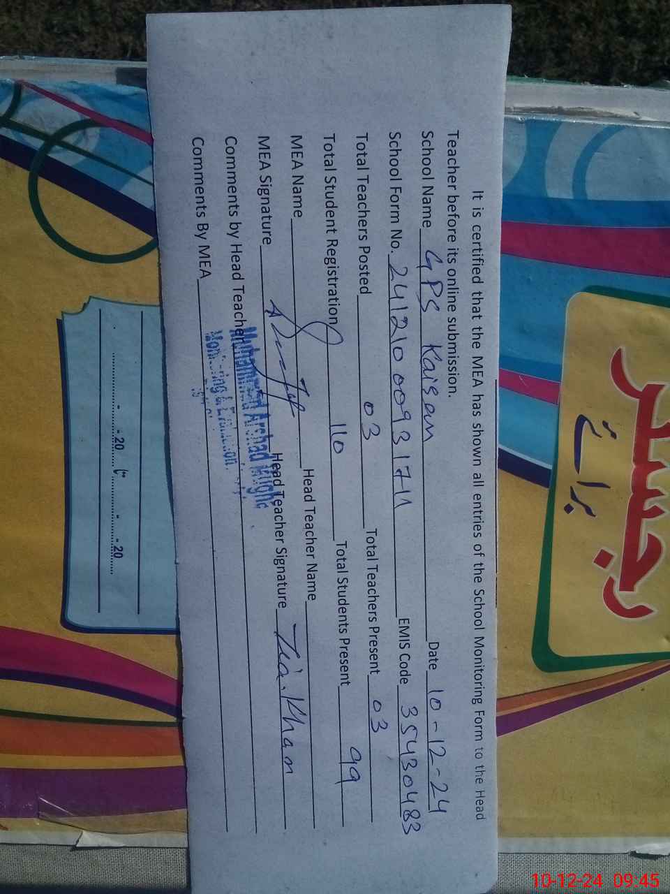 | Attendance Register | Head Teacher | MEA with School | Visit Proof |