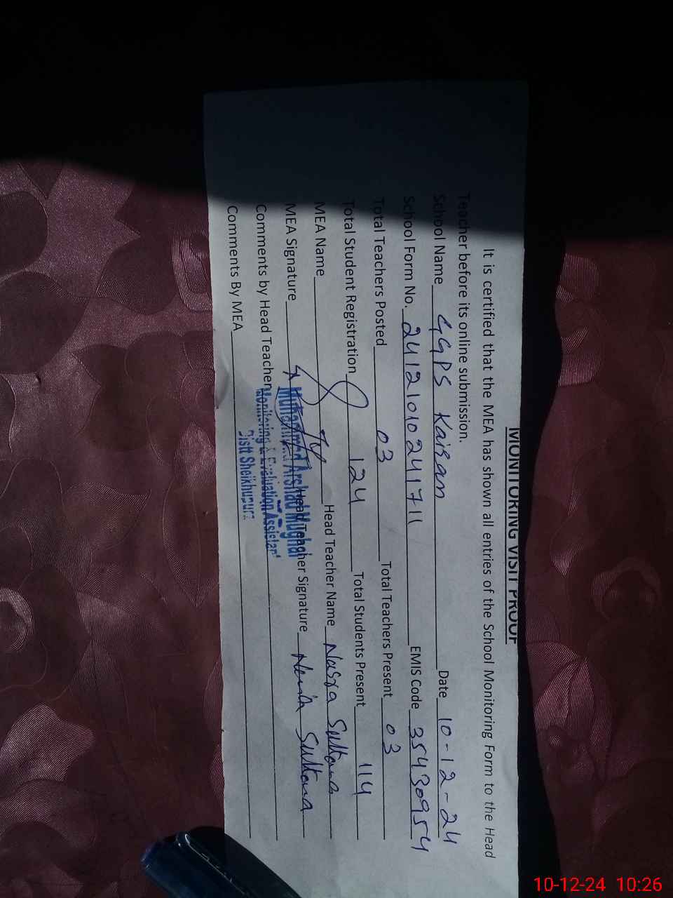 | Attendance Register | Head Teacher | MEA with School | Visit Proof |
