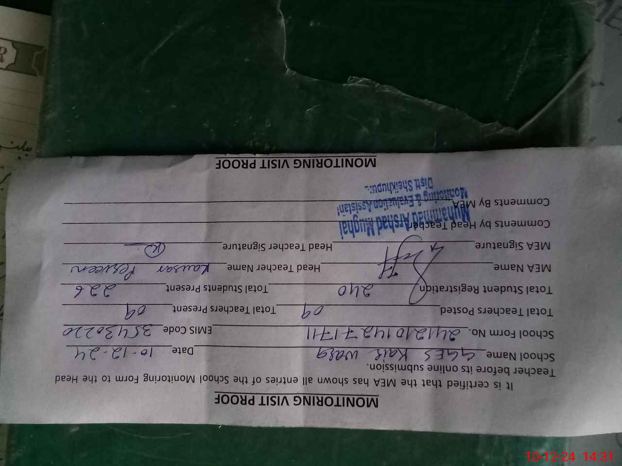 | Attendance Register | Head Teacher | MEA with School | Visit Proof |