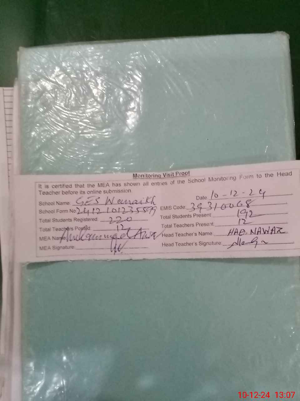 | Attendance Register | Head Teacher | MEA with School | Visit Proof |