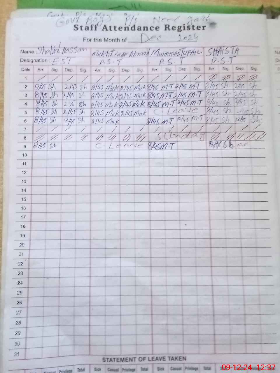 | CNIC | Full Name | Designation | R/C | Absence During Last Calender Month |