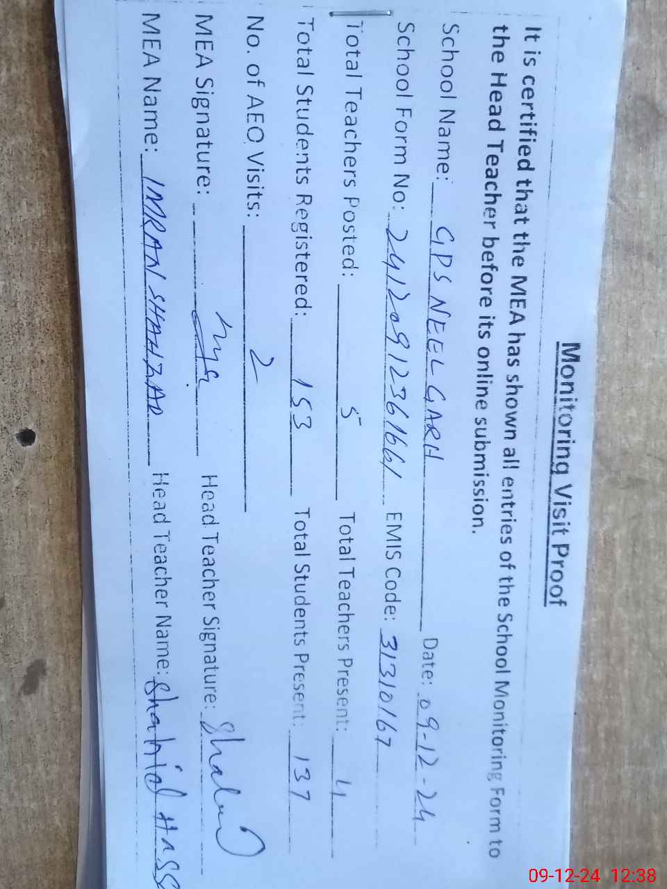 | Attendance Register | Head Teacher | MEA with School | Visit Proof |
