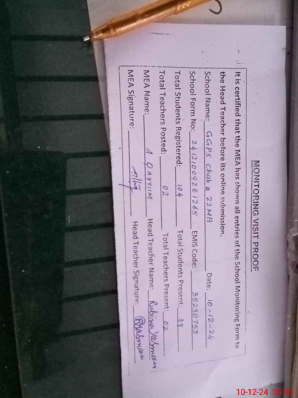 | EMIS Code: 38230753 | Name of School: GGPS CHAK NO 22 MB | |||