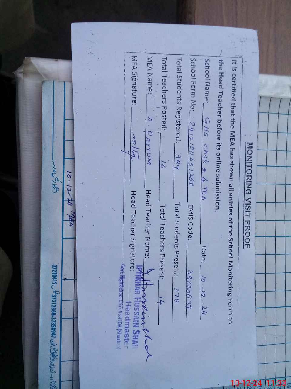 | EMIS Code: 38230837 | Name of School: GHS CHAK NO. 4 TDA | |||