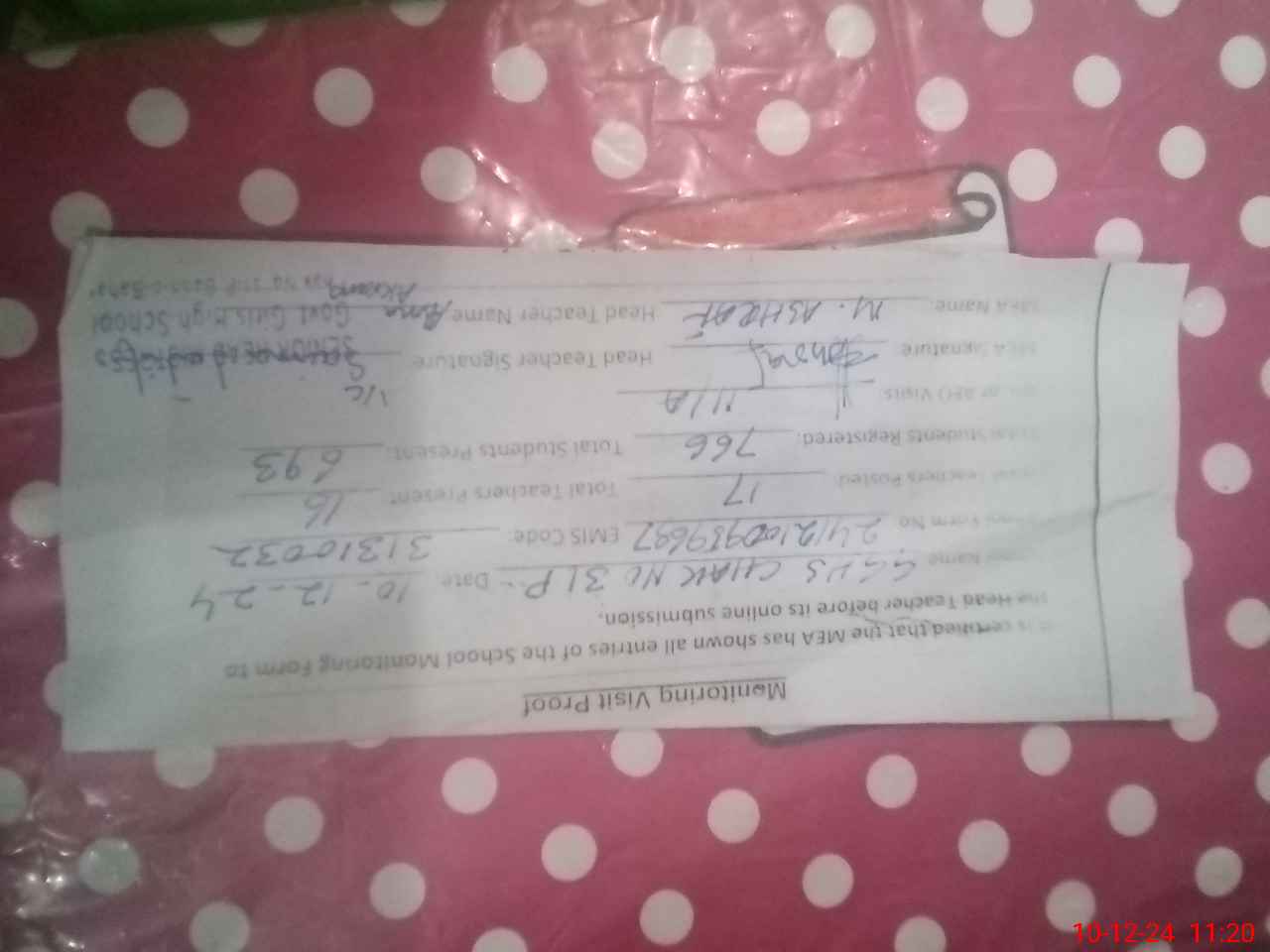 | Name: AS**** AK**** Designation: (School Headmaster's/Headmistress's) SHM Phone/Cell Number: 03**** |