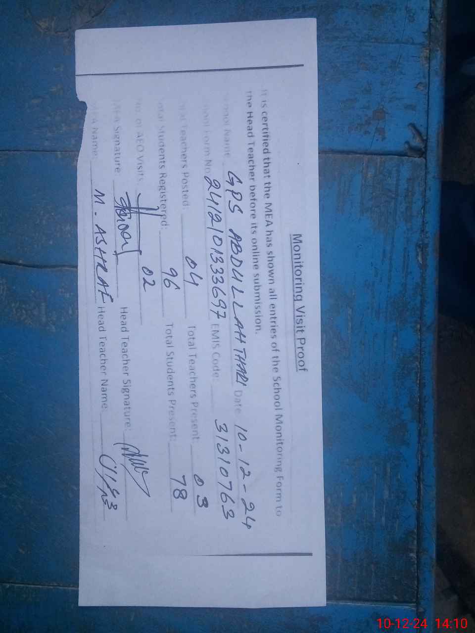 | Attendance Register | Head Teacher | MEA with School | Visit Proof |