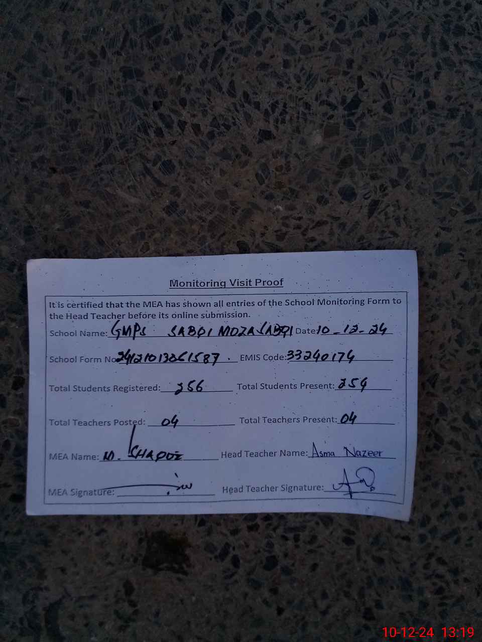 | Attendance Register | Head Teacher | MEA with School | Visit Proof |