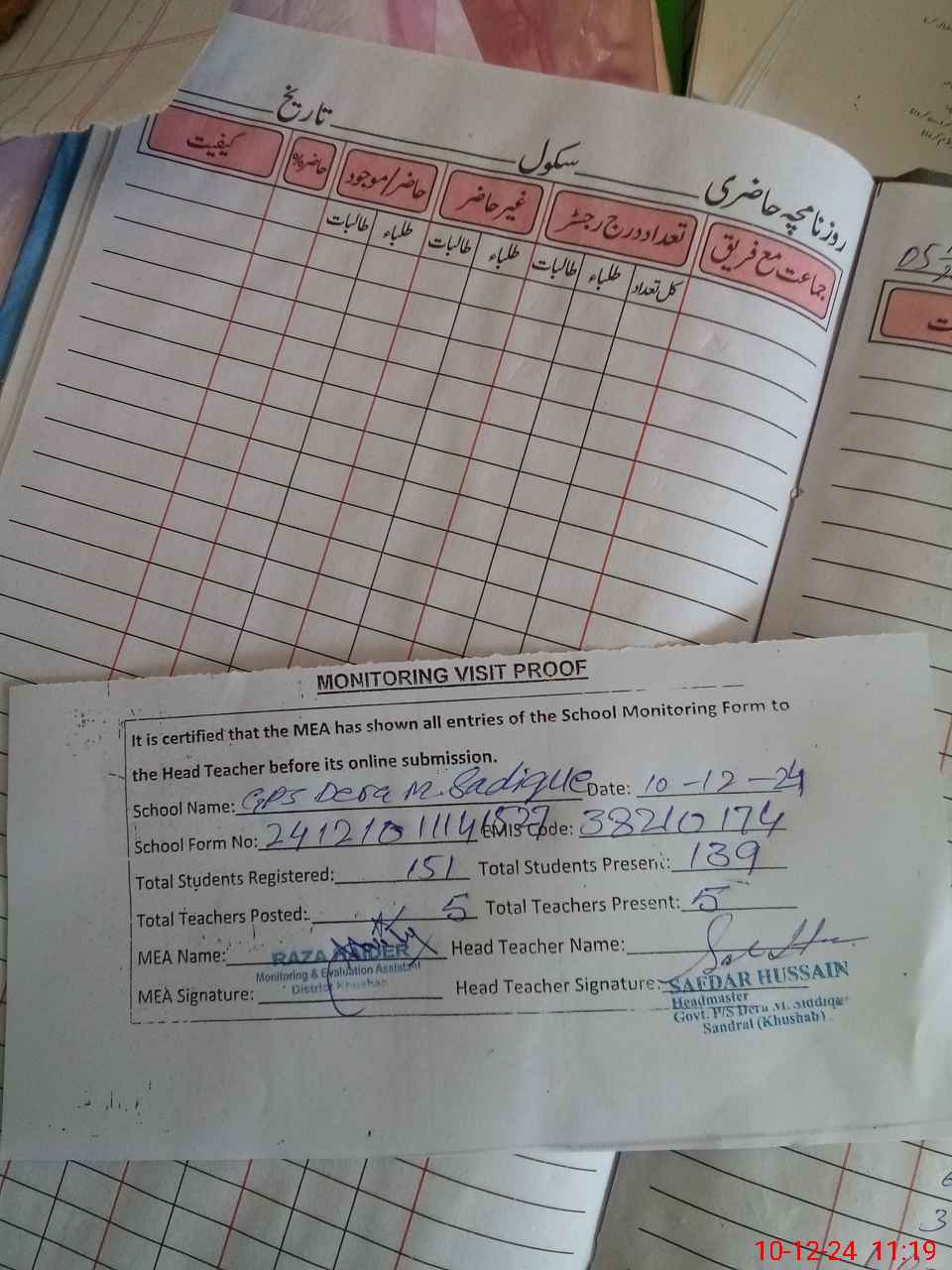 | Attendance Register | Head Teacher | MEA with School | Visit Proof |