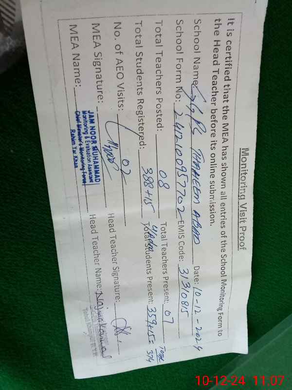 | Certified that this School was Inspected by the Undersigned MEA/DMO Today and the Information Stated Above is as Per Record. | |||||