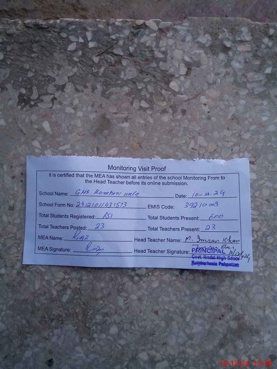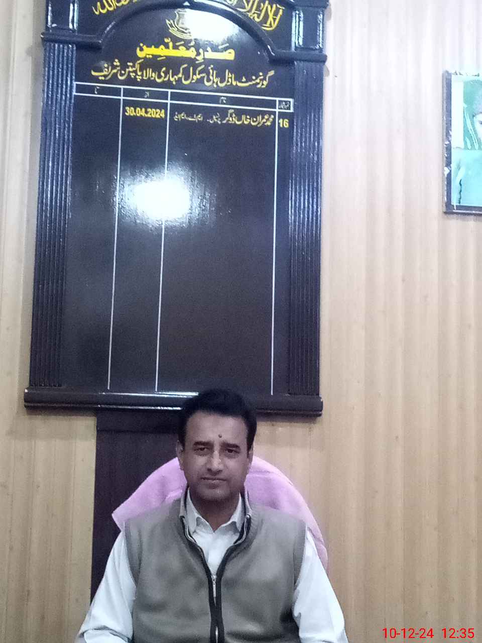 | Name: MU**** IM**** KH**** Designation: (School Headmaster's/Headmistress's) PRINCIPAL Phone/Cell Number: 03**** |