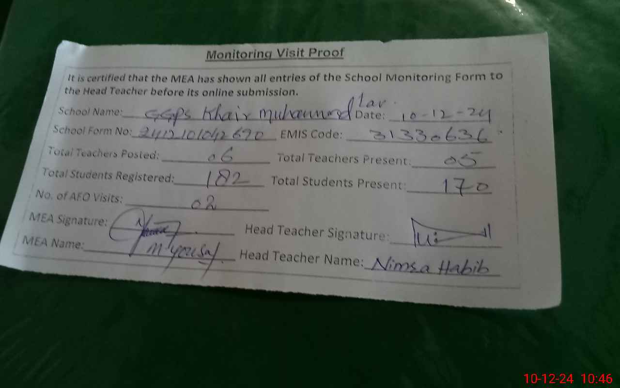 | EMIS Code: 31330636 | Name of School: GGPS KHAIR MUHAMMAD LAR | |||