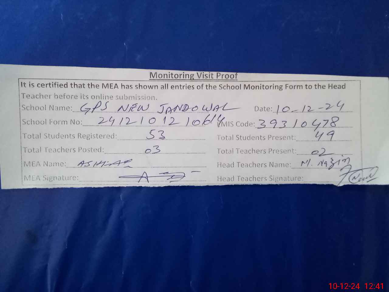 | Attendance Register | Head Teacher | MEA with School | Visit Proof |