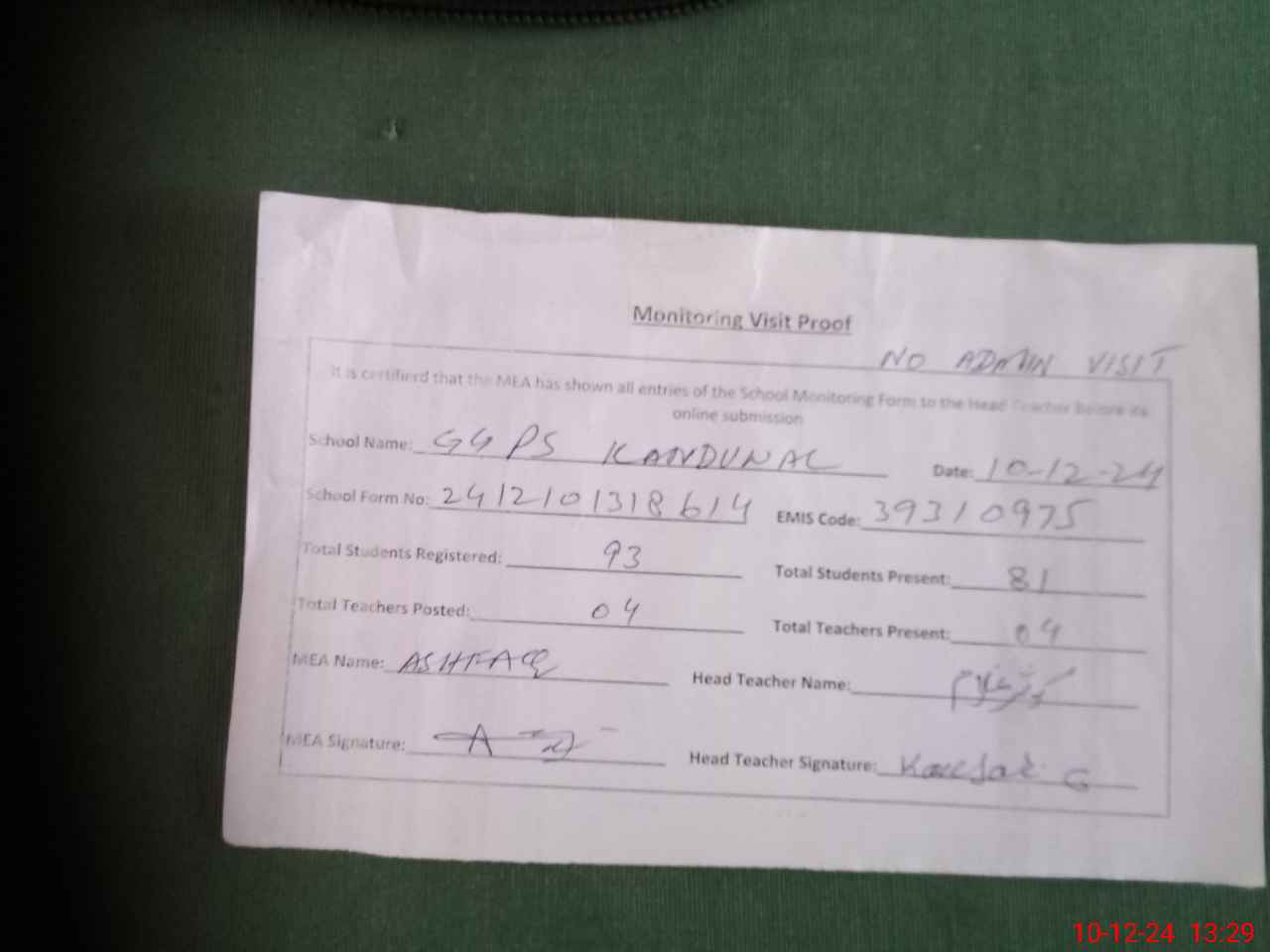 | Attendance Register | Head Teacher | MEA with School | Visit Proof |