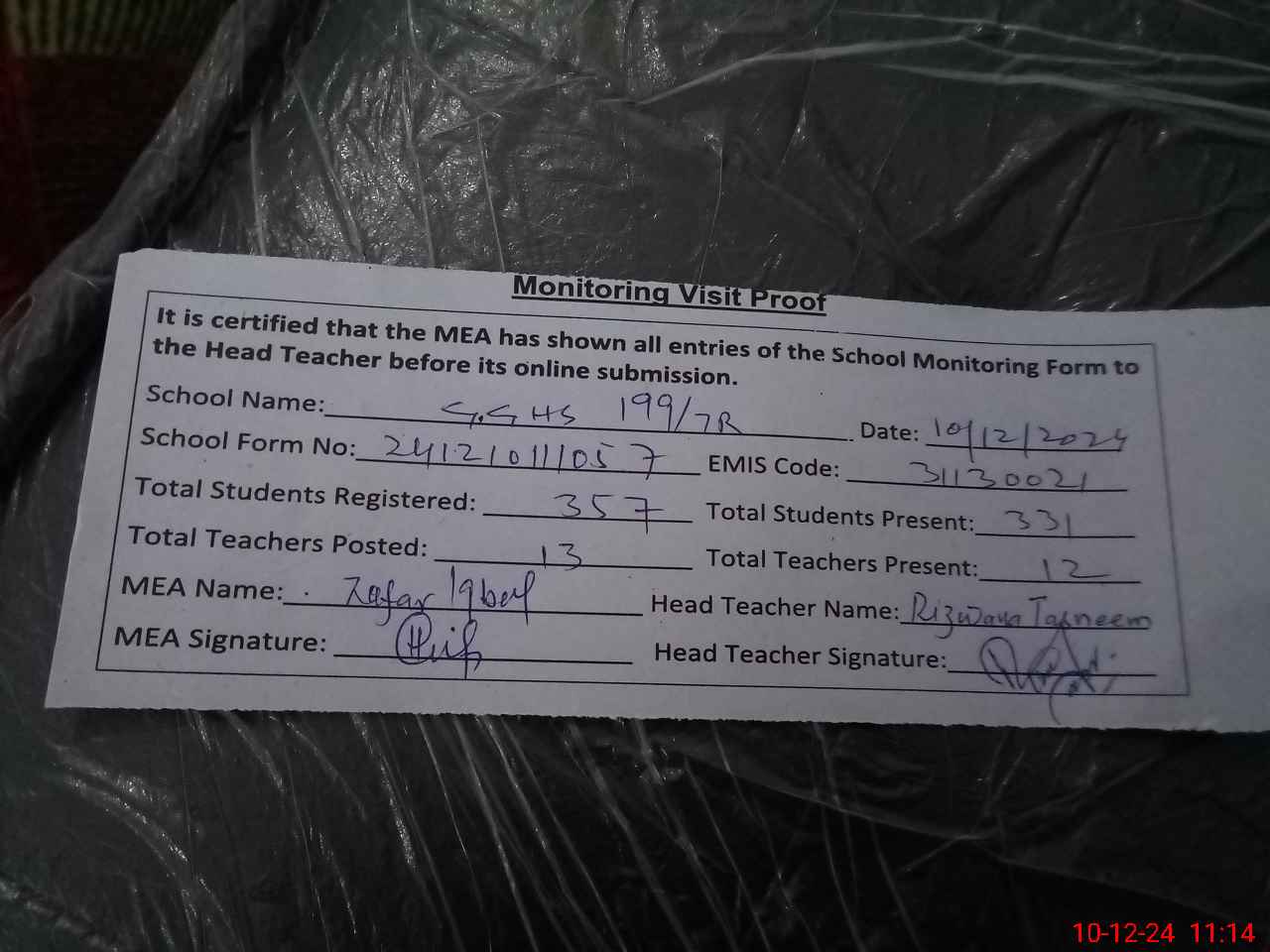 | Monitoring Date: 10-12-2024 | Start Time: 10-12-2024 10:57 AM | End Time: 10-12-2024 11:14 AM | Name of MEA: Za**** Iq**** BN**** | |