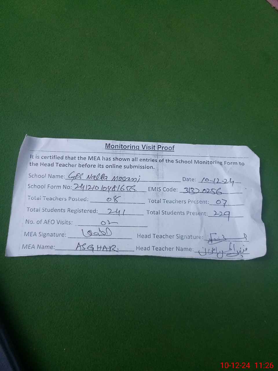 | Certified that this School was Inspected by the Undersigned MEA/DMO Today and the Information Stated Above is as Per Record. | |||||