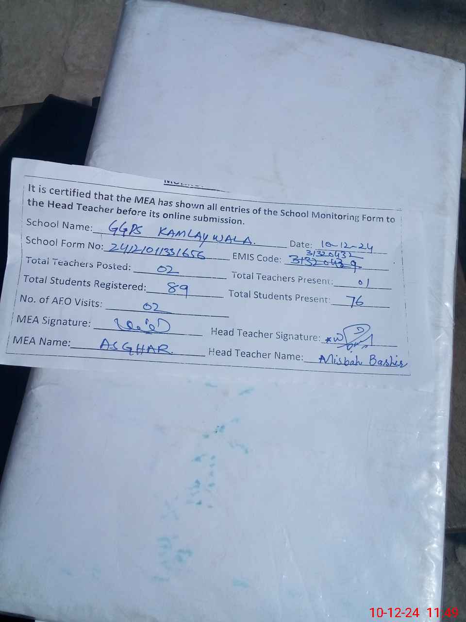 | Remarks (Use Separate Page if Required): Head teacher was on leave and no data was present was available in school like d3 form nsb record etc | |||||