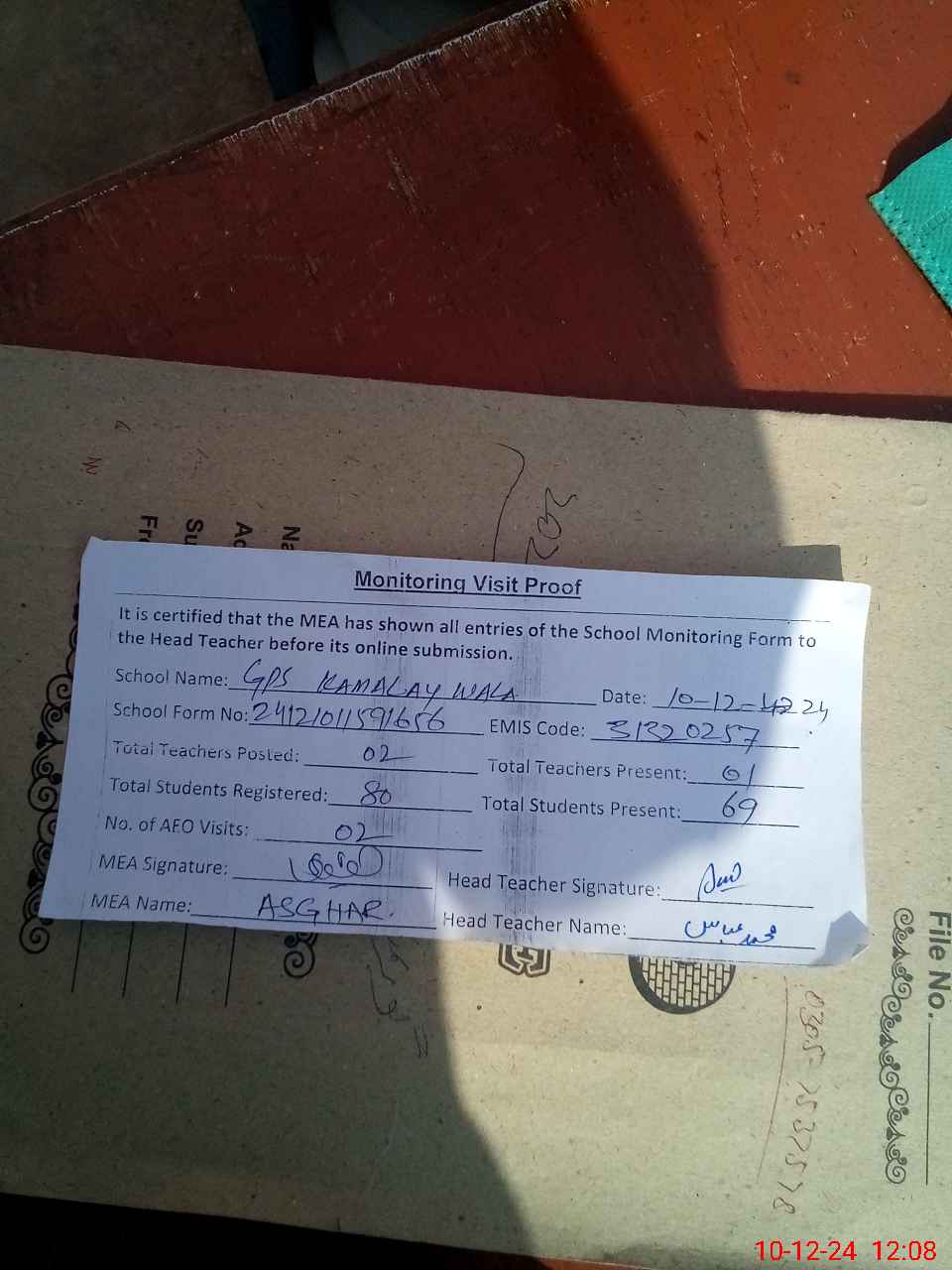 | Attendance Register | Head Teacher | MEA with School | Visit Proof |