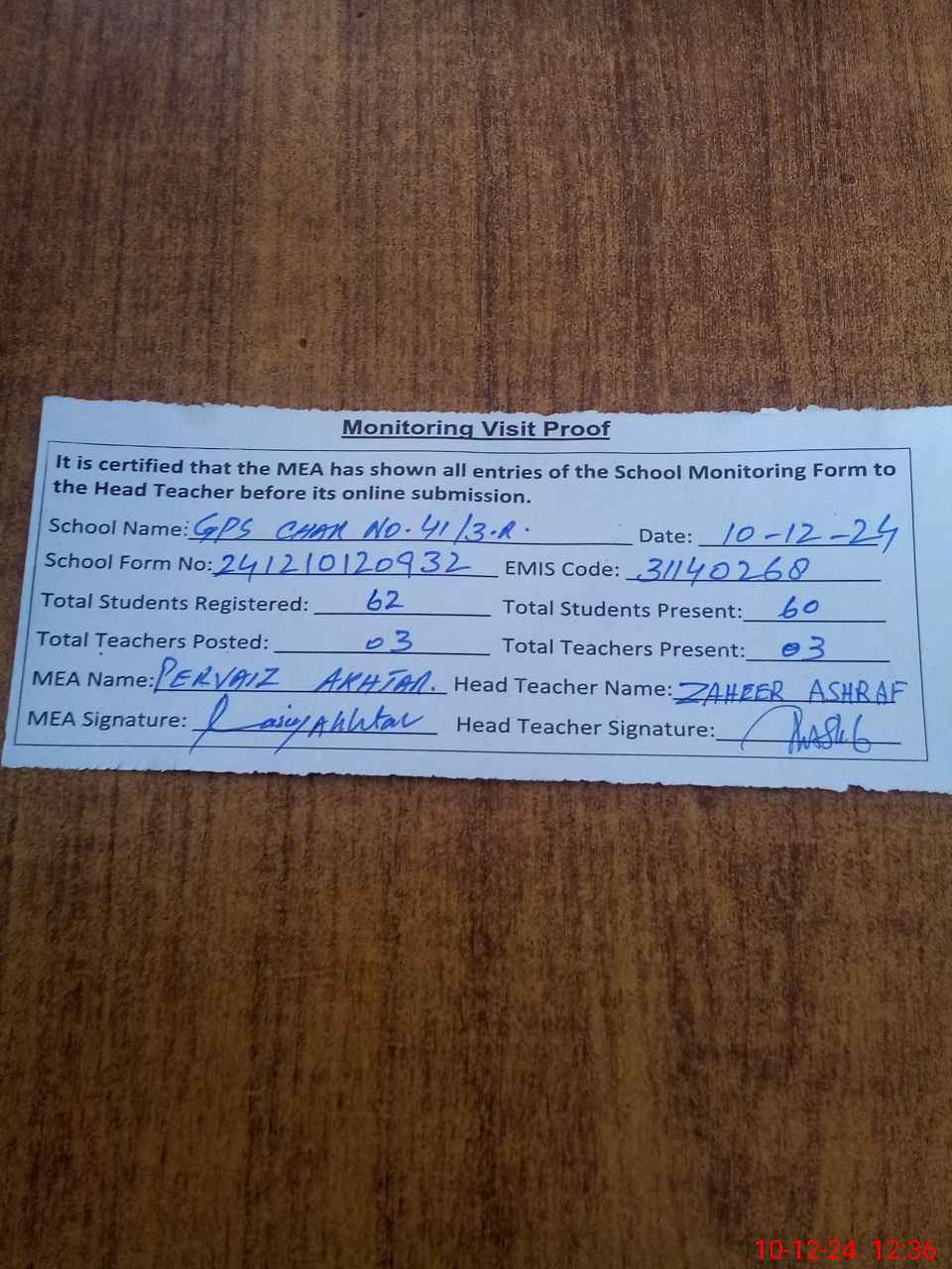 | Attendance Register | Head Teacher | MEA with School | Visit Proof |