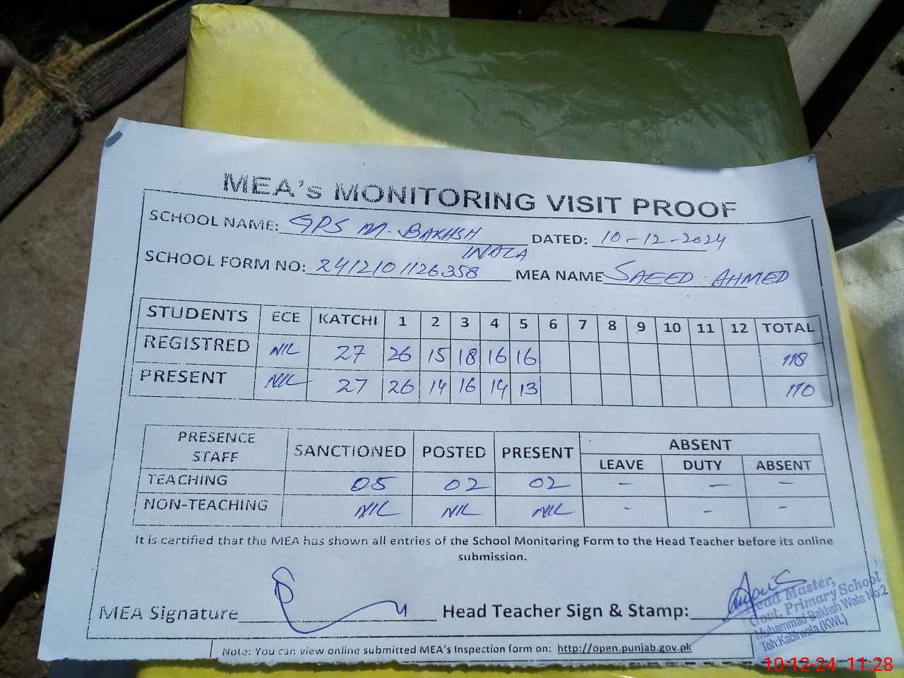 | Attendance Register | Head Teacher | MEA with School | Visit Proof |