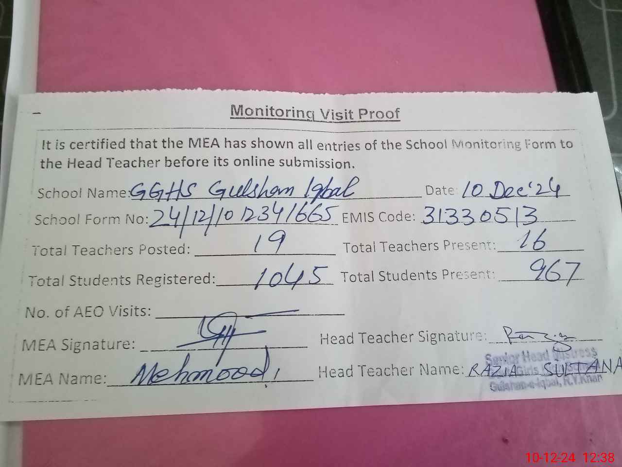 | EMIS Code: 31330513 | Name of School: GGHS GULSHAN IQBAL | |||