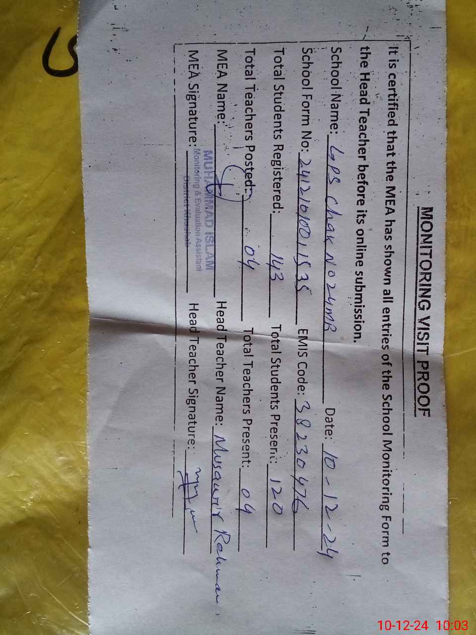 | EMIS Code: 38230476 | Name of School: GPS CHAK NO. 24 MB | |||
