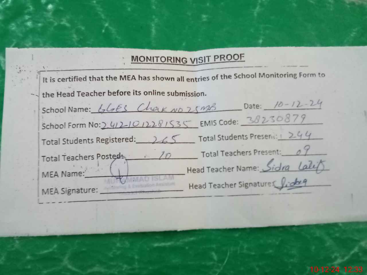 | EMIS Code: 38230879 | Name of School: GGES CHAK NO. 25 MB | |||