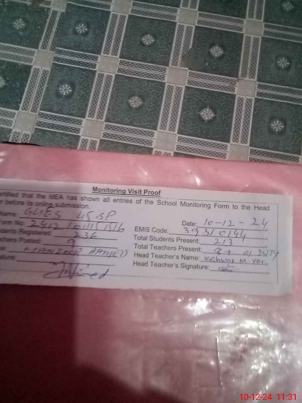 | Attendance Register | Head Teacher | MEA with School | Visit Proof |