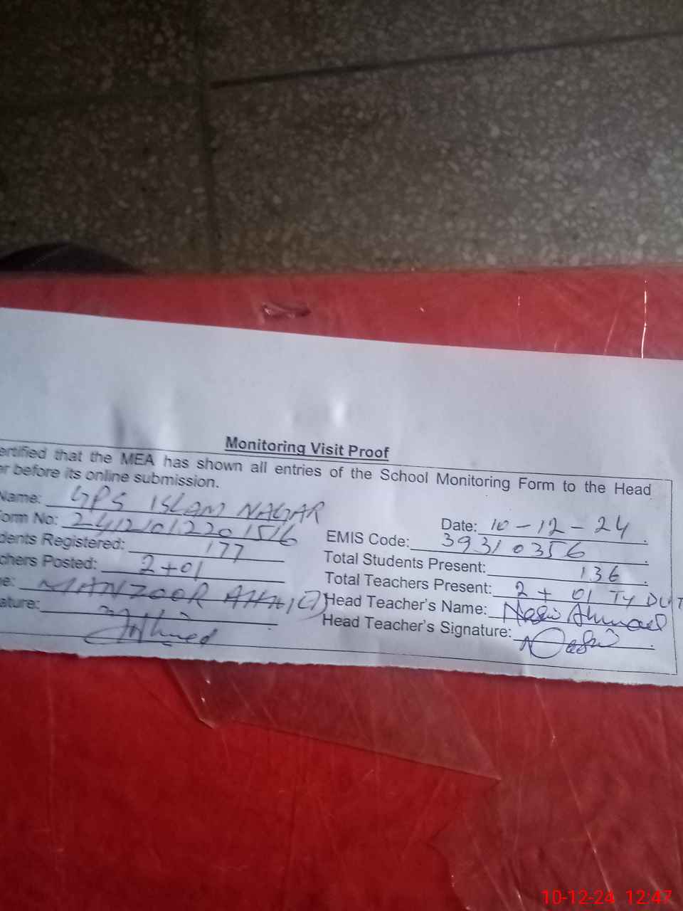 | EMIS Code: 39310356 | Name of School: GPS ISLAM NAGAR | |||