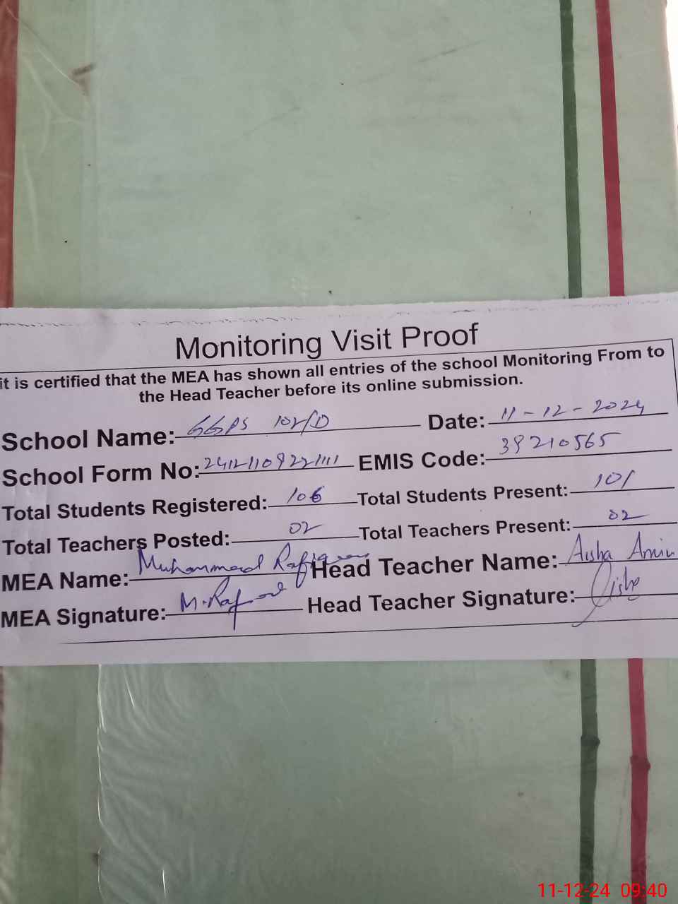 | Attendance Register | Head Teacher | MEA with School | Visit Proof |