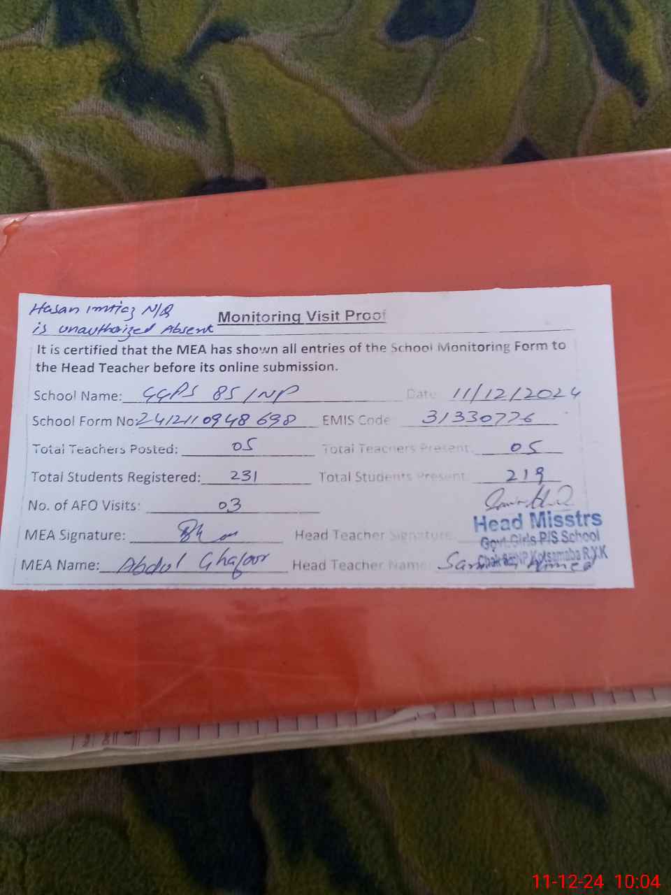 | Attendance Register | Head Teacher | MEA with School | Visit Proof |