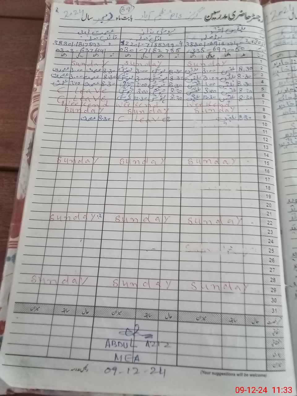 | CNIC | Full Name | Designation | R/C | Absence During Last Calender Month |