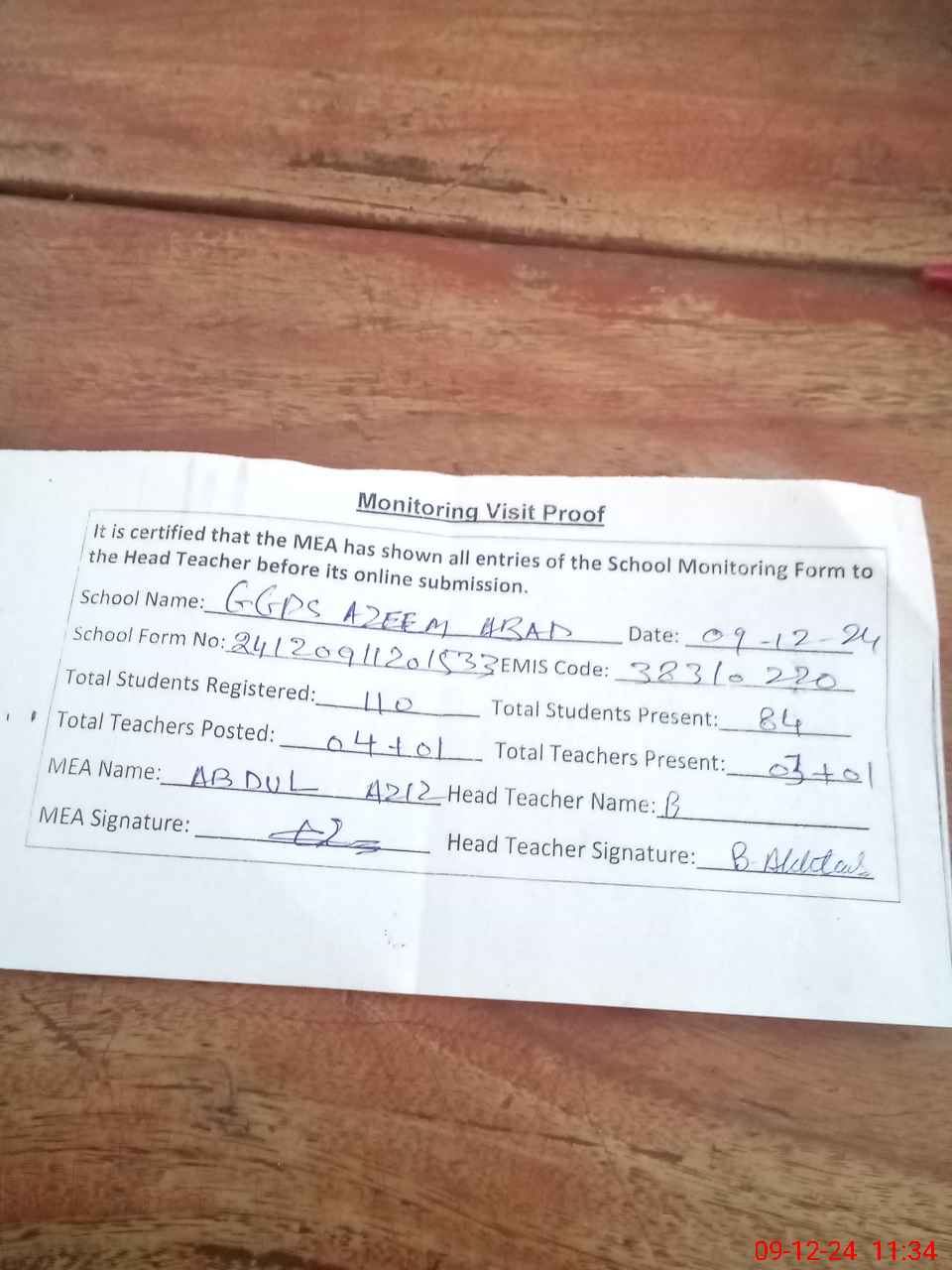| Attendance Register | Head Teacher | MEA with School | Visit Proof |