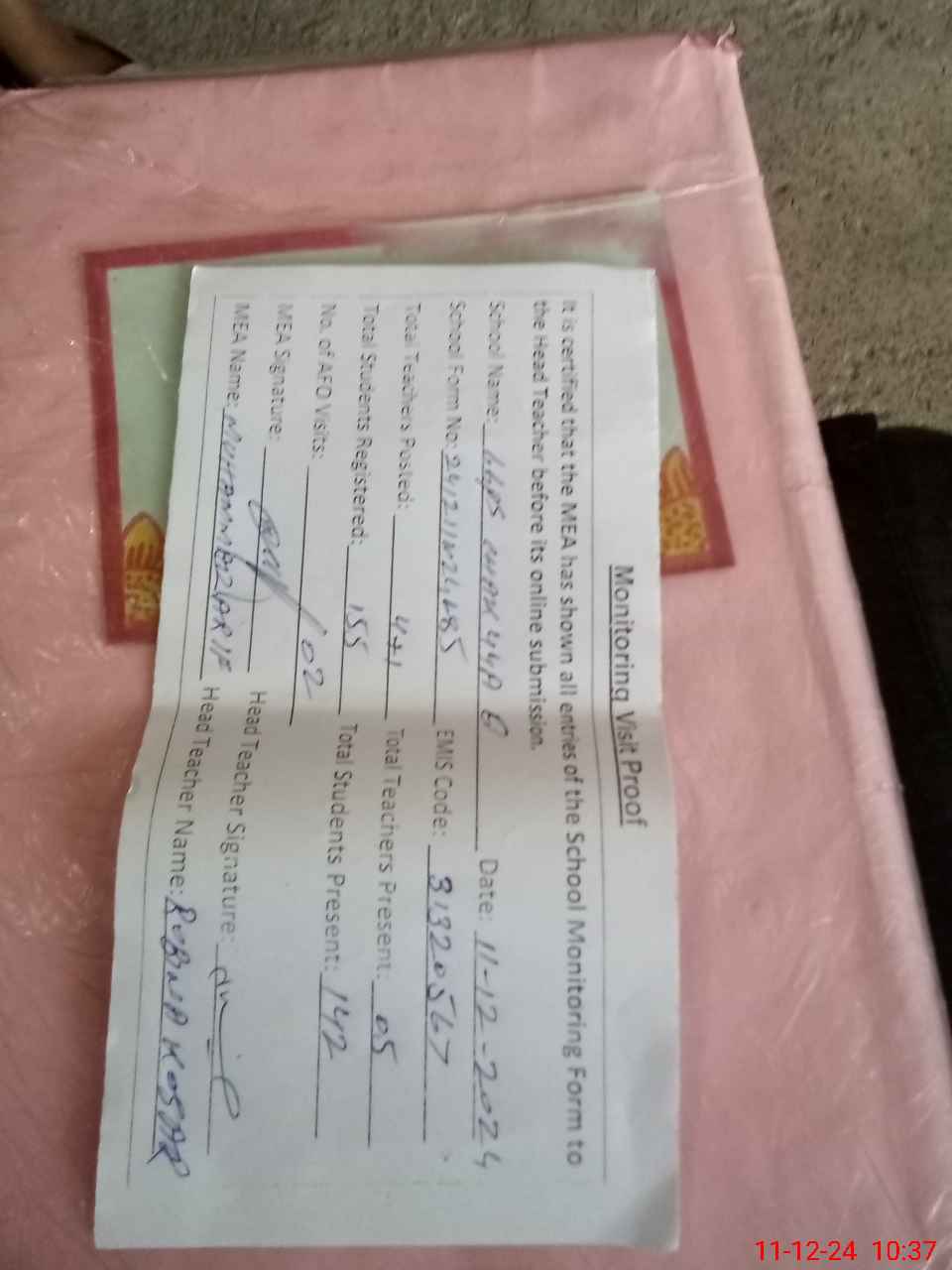 | Attendance Register | Head Teacher | MEA with School | Visit Proof |