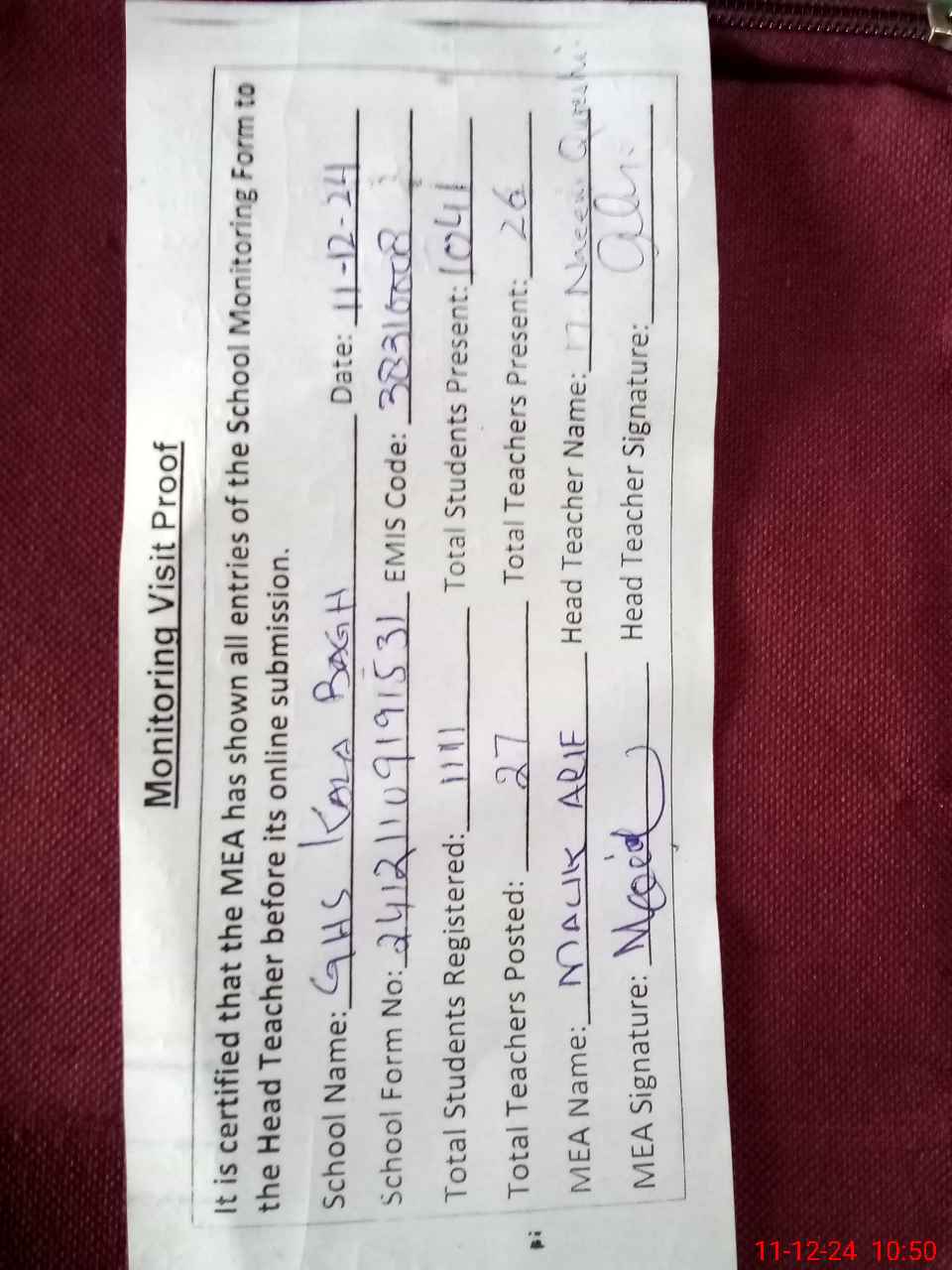 | Attendance Register | Head Teacher | MEA with School | Visit Proof |