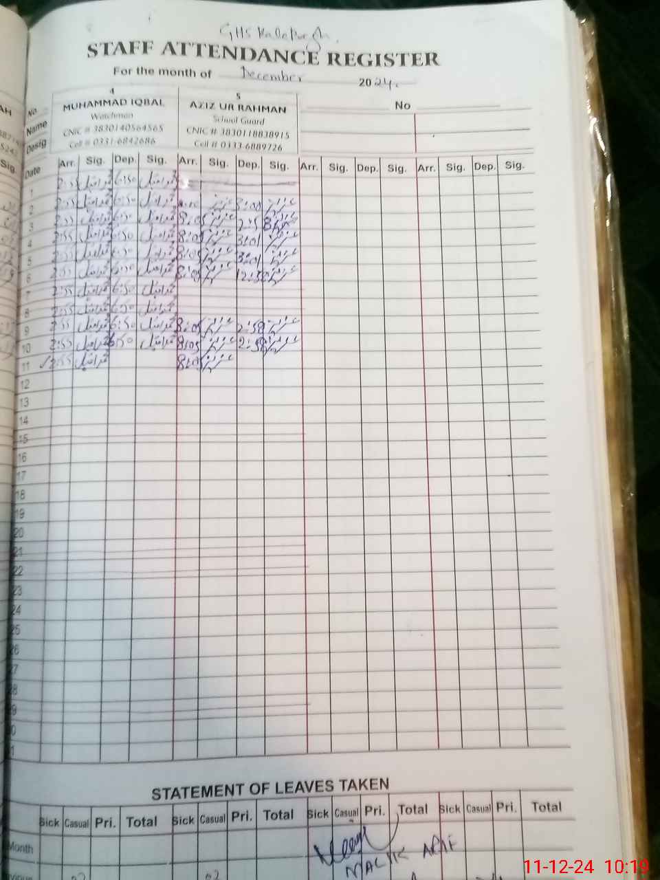| CNIC | Full Name | Designation | R/C | Absence During Last Calender Month |