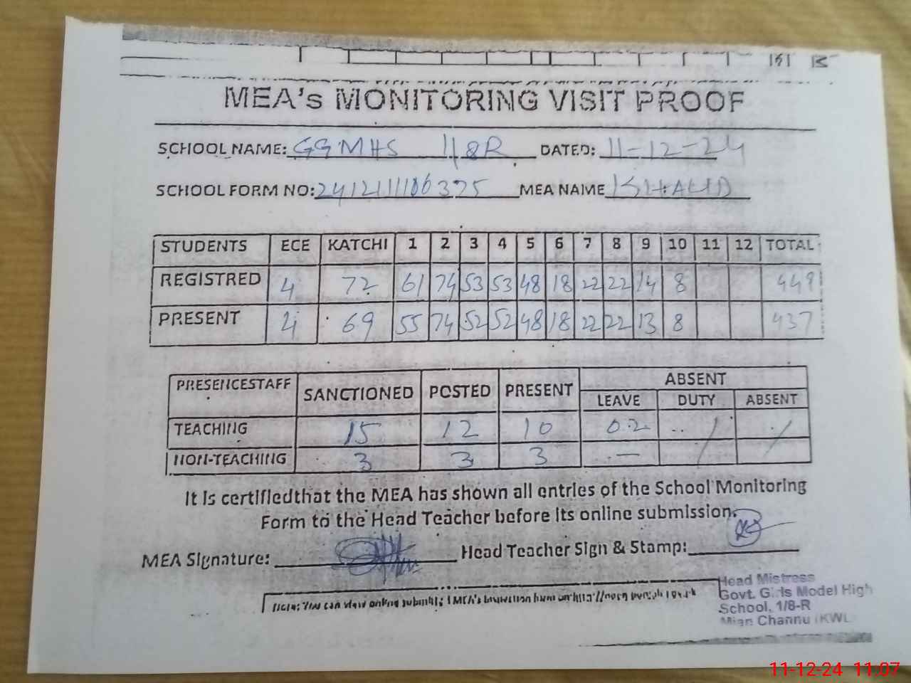| Attendance Register | Head Teacher | MEA with School | Visit Proof |