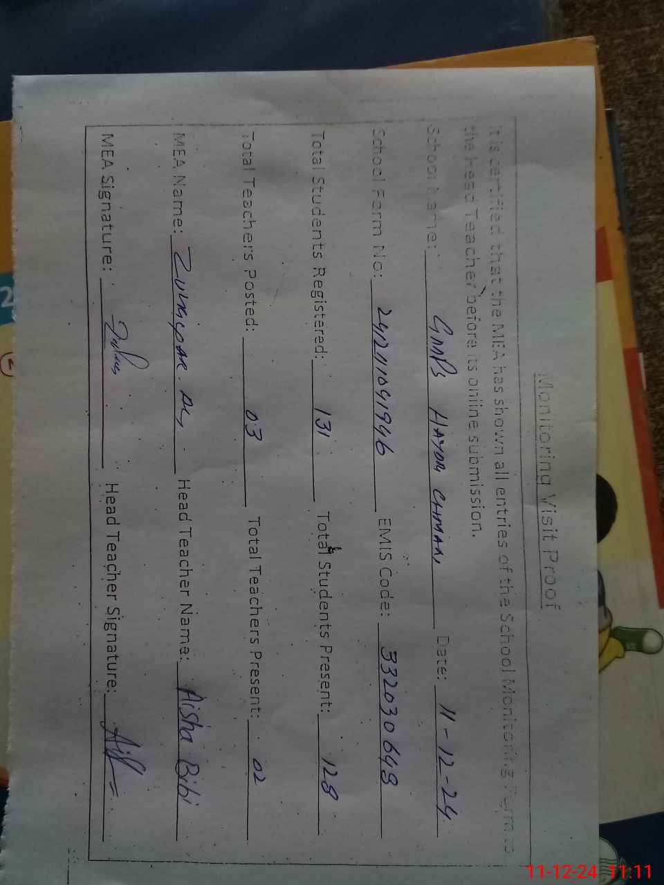 | Attendance Register | Head Teacher | MEA with School | Visit Proof |